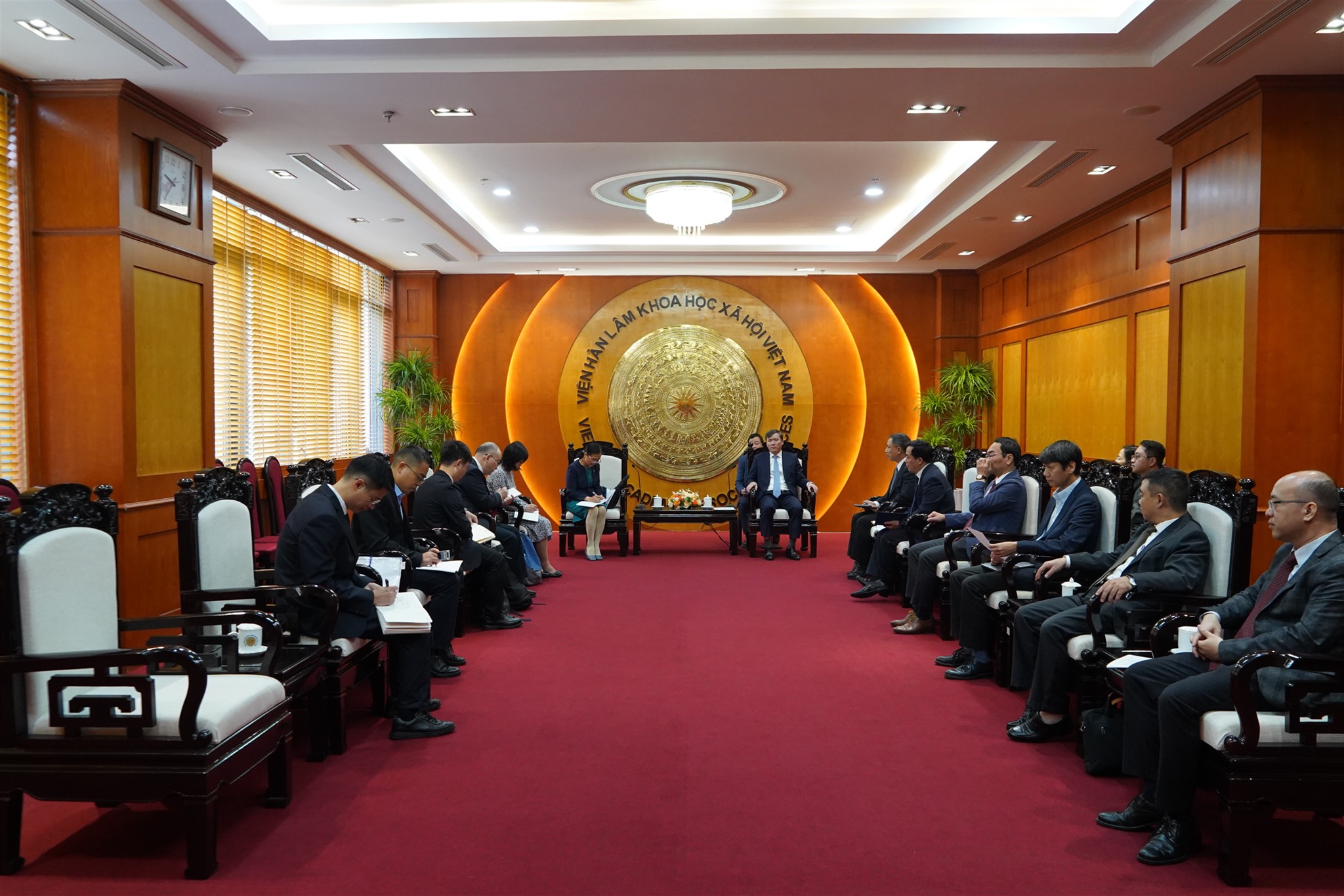 Tiếp đón đoàn cùng Chủ tịch VASS, có ông Nguyễn Thanh Hà, Trưởng ban Ban Hợp tác quốc tế; PGS.TS. Nguyễn Tài Đông, Viện trưởng Viện Triết học; TS. Nguyễn Xuân Cường, Viện trưởng Viện Nghiên cứu Châu Á – Thái Bình Dương; TS. Hoàng Thế Anh, Phó Viện trưởng Viện Kinh tế Việt Nam và thế giới; TS. Đỗ Tá Khánh, Phó Viện trưởng Viện Địa lí nhân văn và Phát triển bền vững; PGS.TS. Chu Văn Tuấn, Viện trưởng Viện Xã hội học và Tâm lý học cùng TS. Vũ Quý Sơn, Viện Nghiên cứu Châu Á – Thái Bình Dương, đảm nhiệm công tác phiên dịch.
